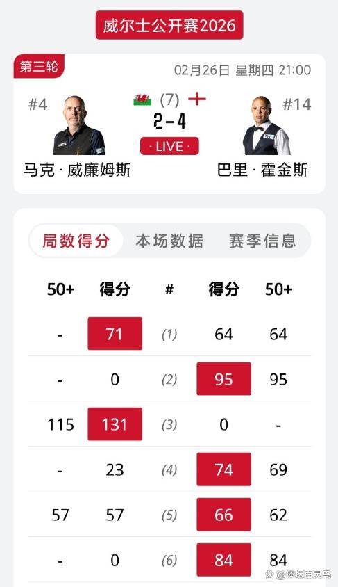 足球直播,世界杯直播,体育直播,足球比分,世界杯,足球赛事,足球,波胆,角球,串关,大小球北京时间2026年2月26日晚上9点,斯诺克威尔士公开赛的16强战在兰迪德诺的Venue Cymru正式打响。 这个夜晚注定要被写进斯诺克的历史,不是因为某位巨星的一杆华丽破百,而是因为冷门像多米诺骨牌一样接连倒下。 当最后一场比赛在次日凌晨结束,八强名单出炉时,人们发现世界排名第四的马克·威廉姆斯和世界排名第五、正处在一波11连胜巅峰的赵心童,竟然双双被挡在了八强门外。两位中国“00后”小将从资格赛杀出的黑马江俊和状态火热的吴宜泽,不仅携手晋级,更因为在同一半区,他们将在四分之一决赛直接对话。 这意味着,无论谁赢,中国斯诺克军团都已经提前锁定了一个四强席位。 一夜之间,冠军争夺的格局被彻底改写。