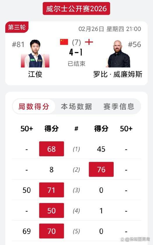 关键的第三局,江俊开始展现他的比赛风格。 他并不追求一杆制胜的华丽,而是用精准的长台和严密的防守控制局面。 他抓住对手的一次失误上手,稳稳地打出一杆50分,以71比0零封对手,再次取得领先。 第四局,江俊延续了这种节奏,他继续用防守给对手施压,罗比·威廉姆斯很难获得连续上手的机会。 江俊以50比1再胜一局,大比分3比1拿到赛点。 没有退路的罗比·威廉姆斯在第五局试图反击,但江俊没有给他任何机会。