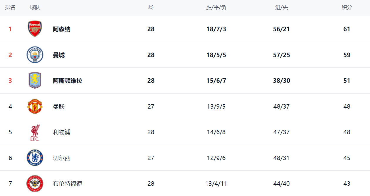 在积分榜,阿森纳依然占据榜首位置,18胜7平3负的战绩,拿到61分。赢球的曼城步步紧逼。曼城总积分达到59分,排名第2,仅仅落后阿森纳2分。冠军的争夺太激烈了,最快下一轮曼城有机会登顶。阿斯顿维拉则不断掉链子,总积分依然是51分,排名第3。曼城以48分排名第4。利物浦赢球之后,也是48分,排名第5。切尔西只拿到45分,掉到第6名。返回搜狐,查看更多