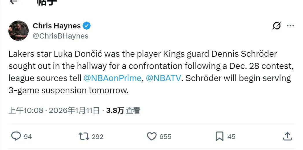 施罗德被禁赛将从明天对阵火箭开始,三场比赛让他损失29.2万美元。大家对这笔罚单有两个疑问:1、两周前的比赛,为啥现在才公布处罚结果?2、施罗德想殴打的湖人球员是谁?Chris Haynes补充报道,这个湖人球员是东契奇!