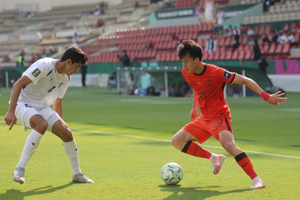 ↑1月17日,中国队球员王钰栋(右)在U23男足亚洲杯四分之一决赛比赛中。新华社记者 王海洲 摄
