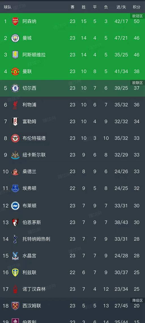 足球直播,世界杯直播,体育直播,足球比分,世界杯,足球赛事,足球,波胆,角球,串关,大小球北京时间1月26日晚至今天凌晨,英超第23轮四场焦点比赛相继落幕,积分榜也随之发生显著变化。昨晚,阿森纳在主场以2-3遗憾负于曼联,连续强势表现的红魔用一场关键胜利证明了自己。与此同时,阿斯顿维拉客场2-0拿下纽卡斯尔联,切尔西则在主场3-1战胜了水晶宫,诺丁汉森林也以2-0战胜布伦特福德,保级形势逐渐明朗。