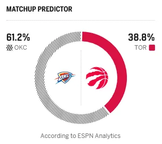 赛前,美媒ESPN预测本场比赛,雷霆胜率61.2%,猛龙胜率38.8%。